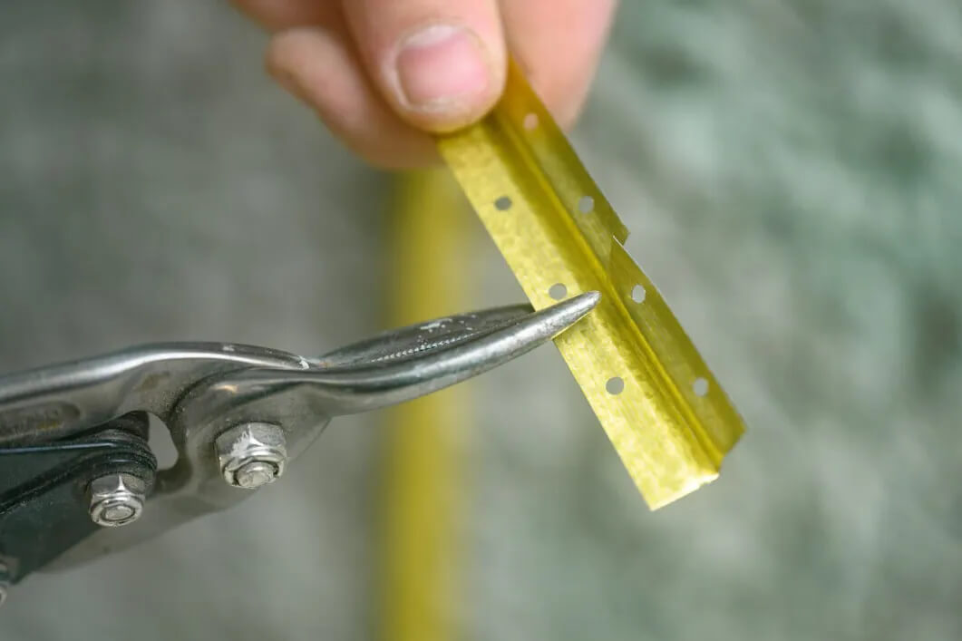 | 4 | Ножницами по металлу или плоскогубцами отрежьте металлический профиль: длина маяка должна быть равна высоте комнаты. Прижмите маяк к гипсовой разметке. Шпателем спрячьте гипс под маяк, чтобы под ним не осталось полостей. Постарайтесь загнать как можно больше раствора под профиль, чтобы он крепче держался. |