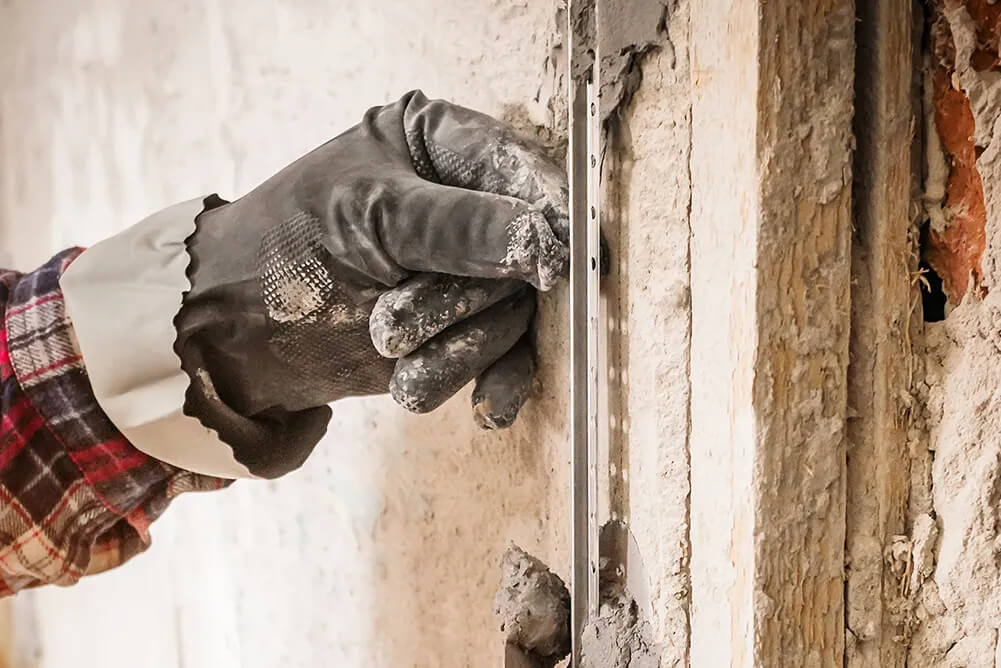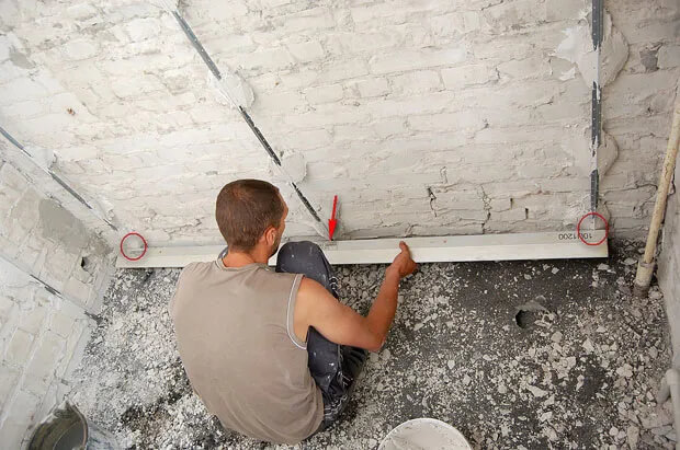 | 2 | После того как обработанная грунтом стена подсохнет, нужно оценить, насколько стена неровная, и прикинуть, какое количество штукатурки понадобится для ее выравнивания. Для этого используют лазерный нивелир или отвес. |