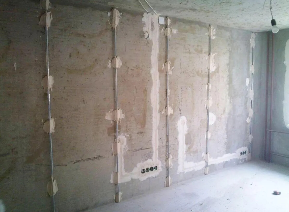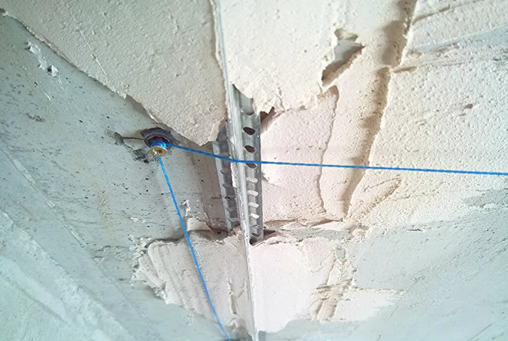 Струнные маяки — наиболее экономичный вариант, так как их можно изготовить из подручных материалов, таких как струны или капроновые нити. Они закрепляются вдоль стен на двух упорах, и под них накладывается раствор, создавая жесткую конструкцию. Штукатурка наносится между струнами, и выравнивается с их помощью. Главный плюс струнных маяков — минимальный слой штукатурки. После завершения работ струны удаляются.Установка металлических маяков