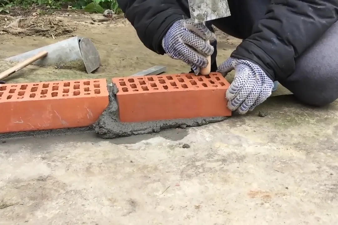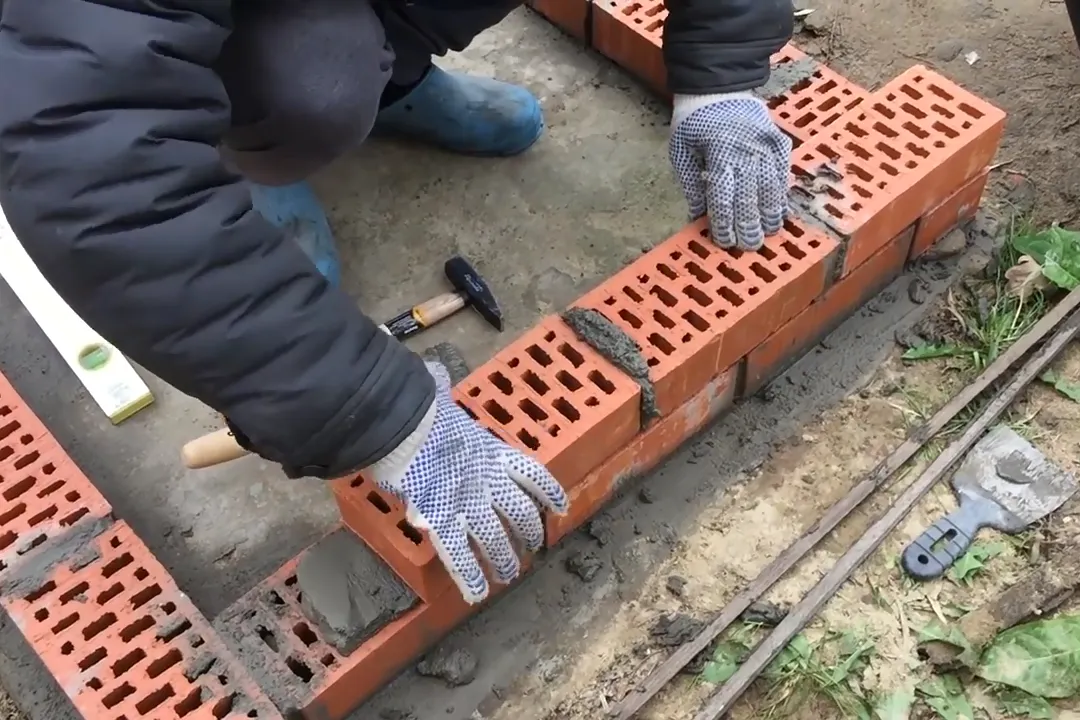 | 4 | Выложите второй ряд, сместив кладку на полкирпича относительно предыдущего ряда. |