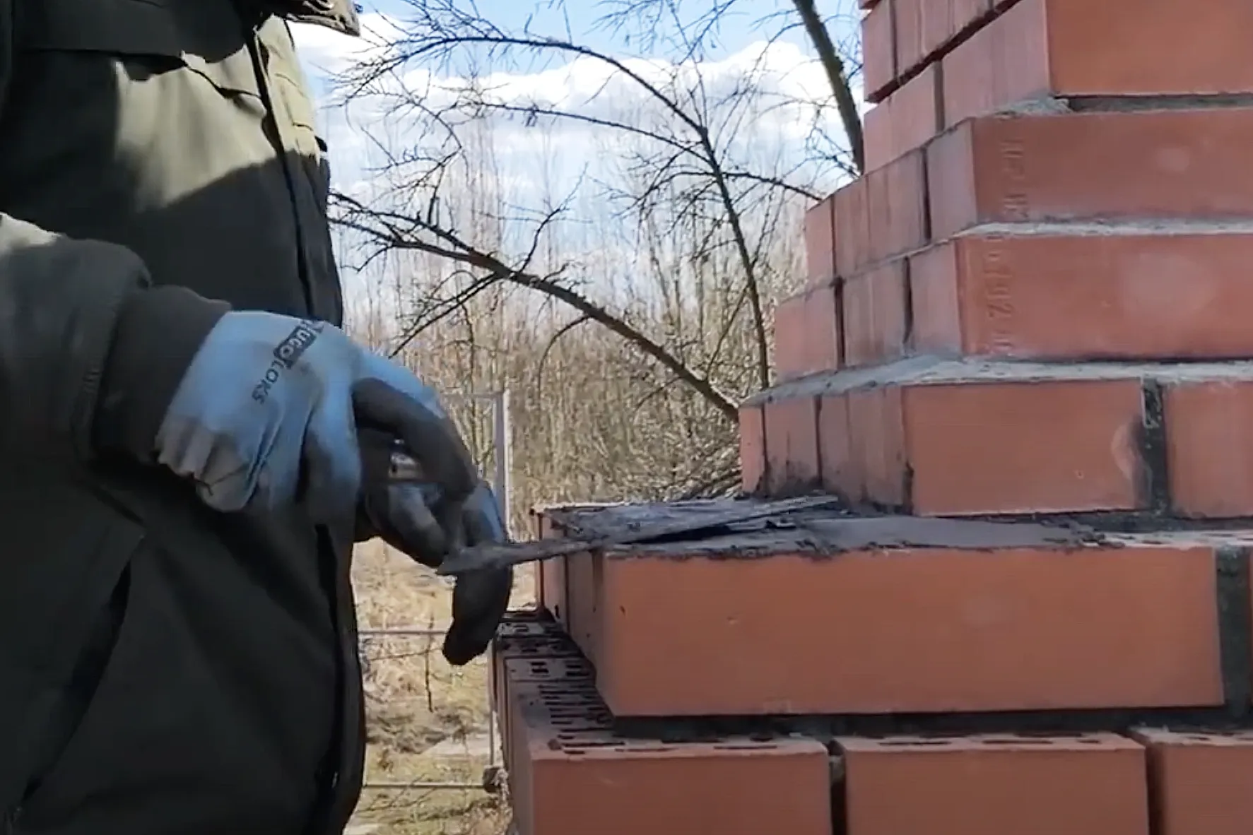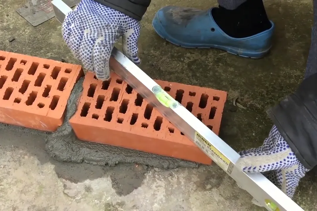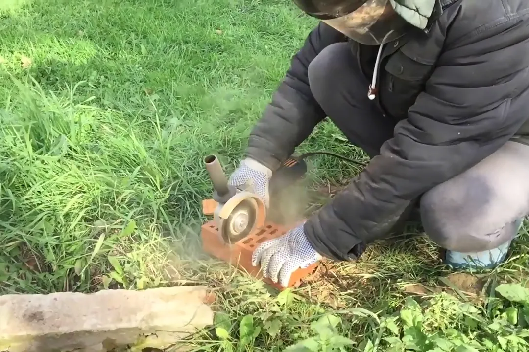 | 5 | Для второго ряда потребуются половинки кирпича — отрежьте их с помощью болгарки. Соблюдайте технику безопасности при работе с болгаркой, используйте защитные перчатки и очки. |