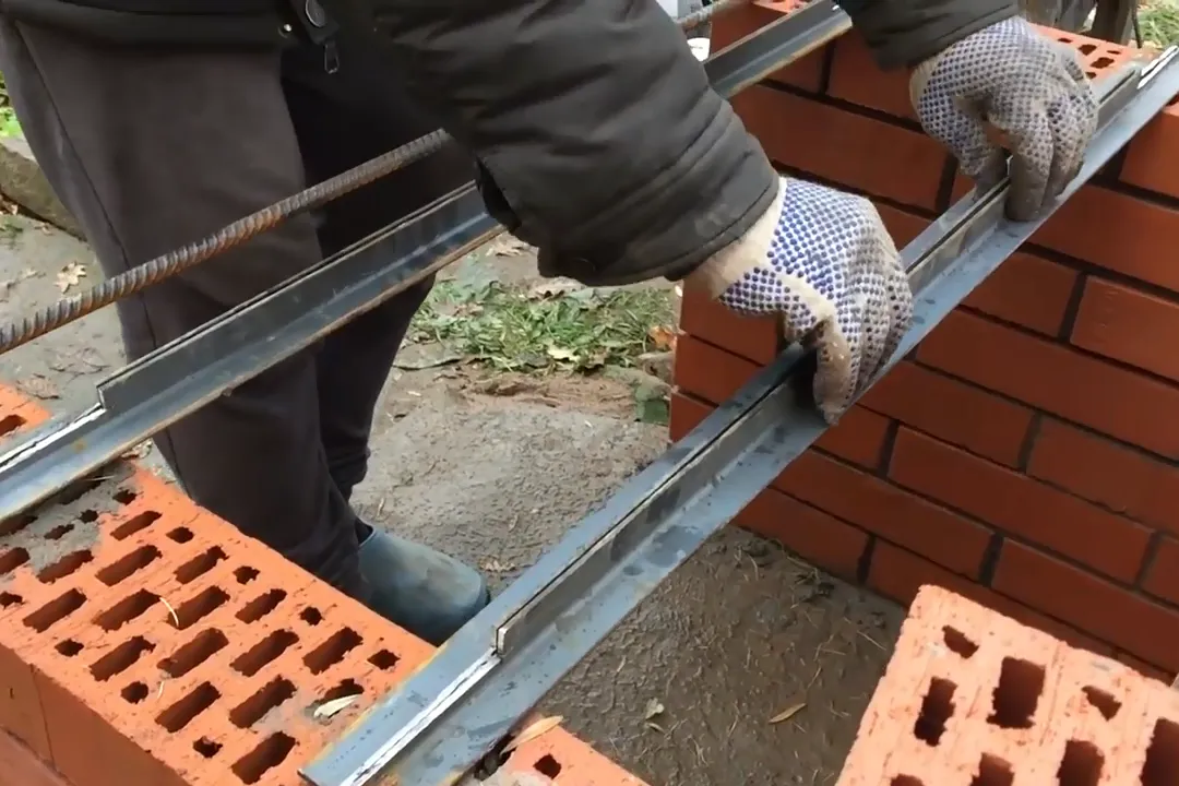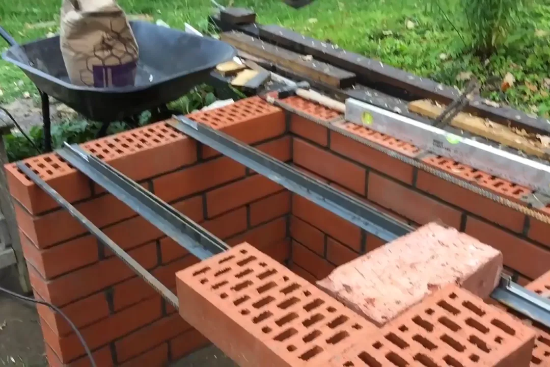 | 10 | Из металлического уголка сделайте опору для верхнего перекрытия очага. Выложите ряд кирпичей, укладывая их поперек на боковые стороны так, чтобы снаружи свисало по 3 см кирпича. |