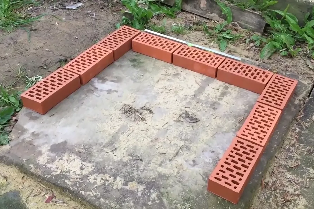 | 8 | Выложите с четырех сторон по периметру очага 3 ряда кирпичей, опирая их на стенки и опору из арматуры и уголков. Дно очага заложите огнеупорным кирпичом без раствора — щели между ними оставьте открытыми для поступления воздуха к горящим углям. |