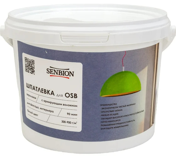 Акриловая шпатлевка с армирующим волокном для OSB SENBION 3 кг S-Шп-15221/3 предназначена для финишной подготовки, выравнивания и заделки стыков, сколов, отверстий от саморезов в строительных конструкциях из дерева.