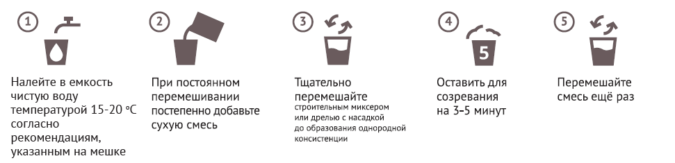 Налейте в емкость чистую воду температурой 15–20 0С из расчета 0,2 л на 1 кг клея для блоков STANDARD. Содержимое мешка при постоянном перемешивании постепенно засыпать в емкость и перемешать до однородной массы миксером или дрелью с насадкой при скорости 400–800 об/мин, выдержать 3–5 минут и перемешать еще раз на протяжение 1–2 минуты.