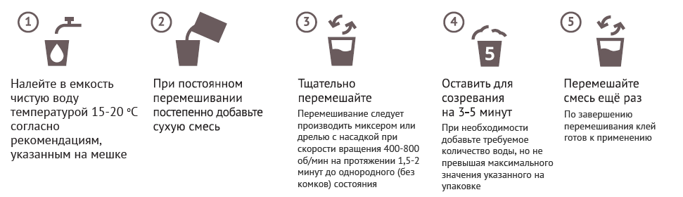 - Для достижения требуемой консистенции, необходимо добавлять количество воды рекомендованное производителем клея, эти значения указаны на мешке.